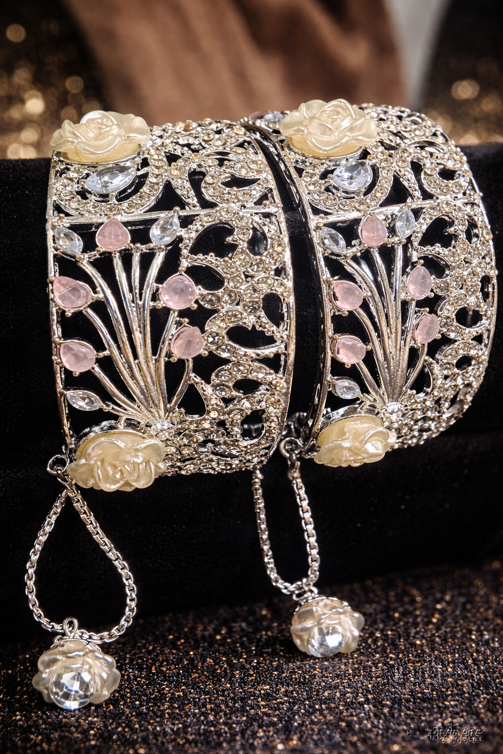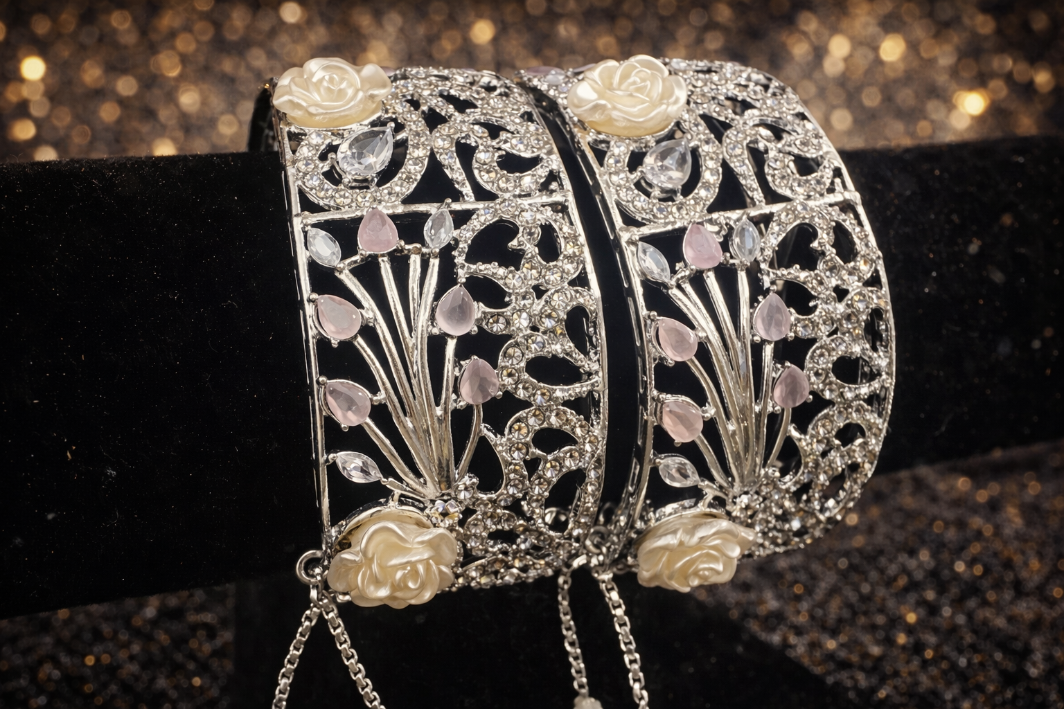 Silver Crystal Floral Openable Bangles with Rose Detailing – Bridal & Party Wear Jewelry
