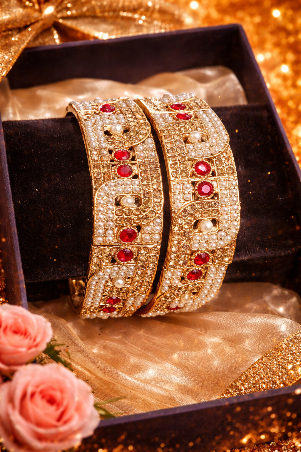 These stunning bridal bangles are crafted in a rich gold finish and beautifully embellished with ruby red stones, delicate pearl detailing, and sparkling crystal accents. Designed with an elegant traditional pattern, these bangles offer a regal and timeless appeal. Perfect for brides and festive wear, they complement wedding outfits, lehengas, sarees, and formal ethnic looks. An exquisite statement piece that adds royal charm to any jewelry collection.Red