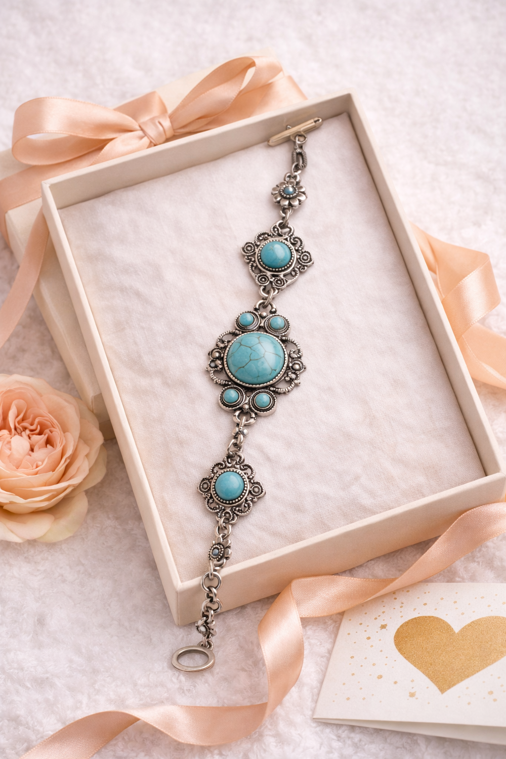 This exquisite bracelet showcases a striking central turquoise medallion surrounded by delicately detailed silver-tone accents and smaller turquoise stones. Inspired by antique and bohemian artistry, each link reflects fine craftsmanship and timeless elegance. Beautifully presented in gift-ready packaging, this bracelet is ideal for special occasions, festive wear, or as a thoughtful luxury gift.