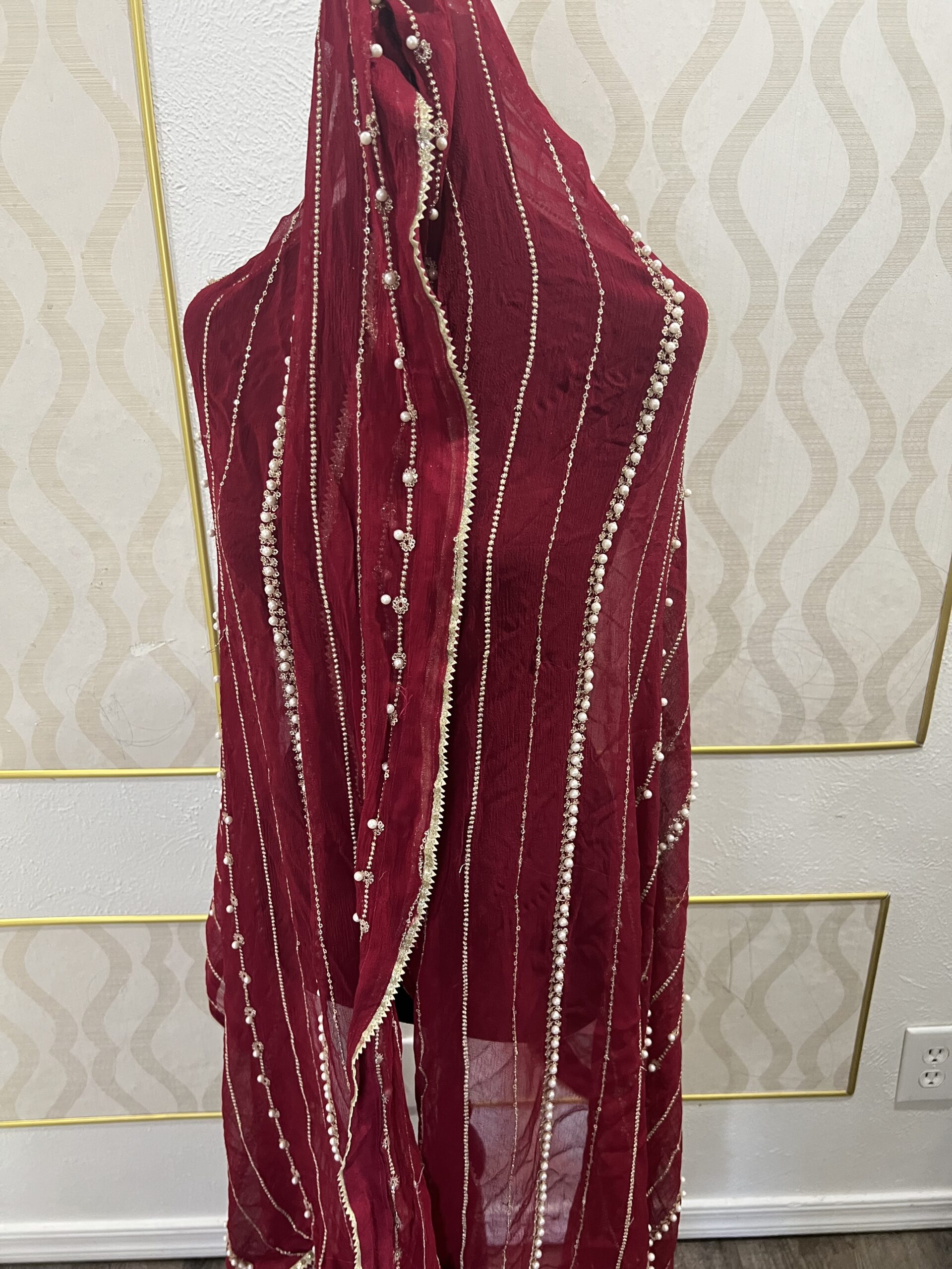 This exquisite maroon organza dupatta is beautifully adorned with delicate pearl drops and fine gold bead stripes, creating a graceful and luxurious look. The soft sheer fabric drapes effortlessly, while the subtle scalloped border adds a refined finish. Perfect for weddings, festive events, and formal occasions, this dupatta adds timeless elegance to any traditional outfit.