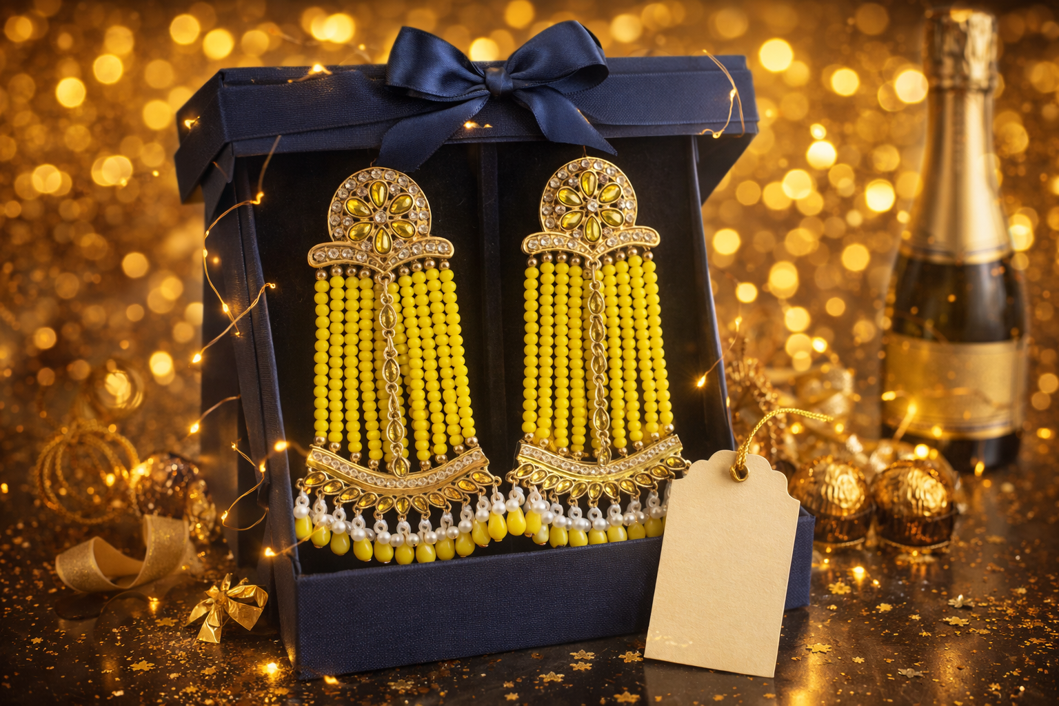 Yellow Beaded Chandelier Earrings with Pearl Drops – Festive Statement Jewelry