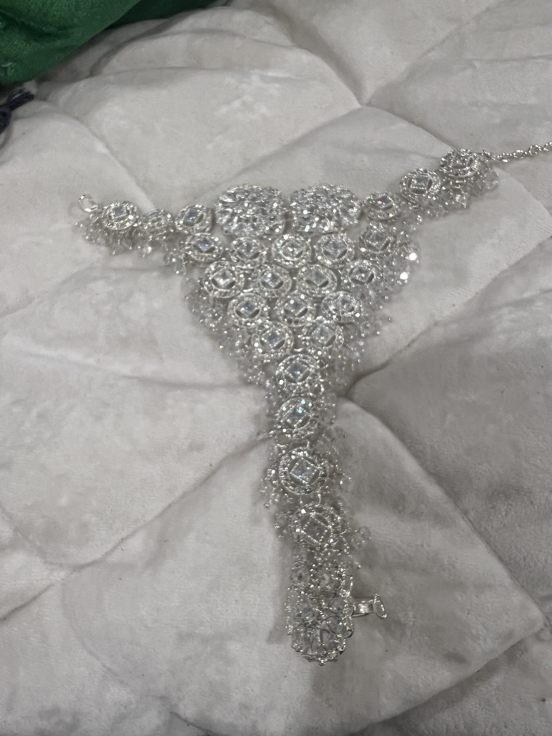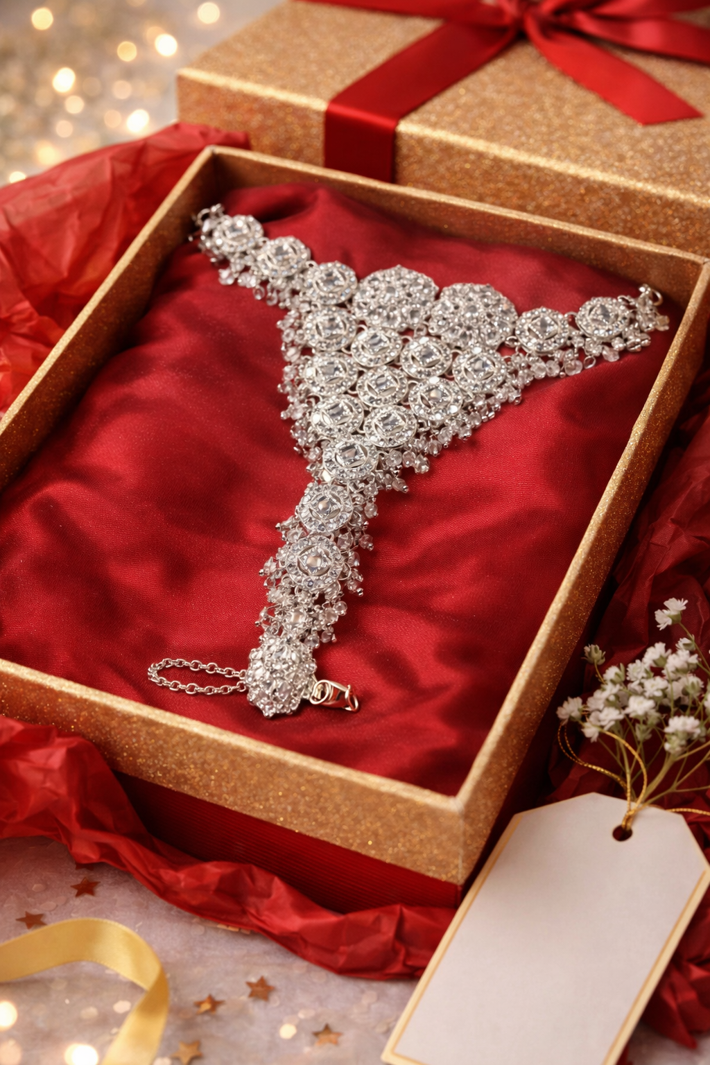 Elevate your bridal look with this stunning silver crystal hand harness bracelet, beautifully designed with intricate round-cut stones and delicate detailing. This elegant haath phool connects a statement bracelet to a graceful finger ring, creating a dazzling cascade of sparkle across the hand. Perfect for weddings, engagements, receptions, and festive occasions, this piece adds a touch of royal glamour and timeless sophistication. Lightweight, comfortable, and exquisitely crafted, it is the perfect accessory to complete any bridal or formal ensemble.