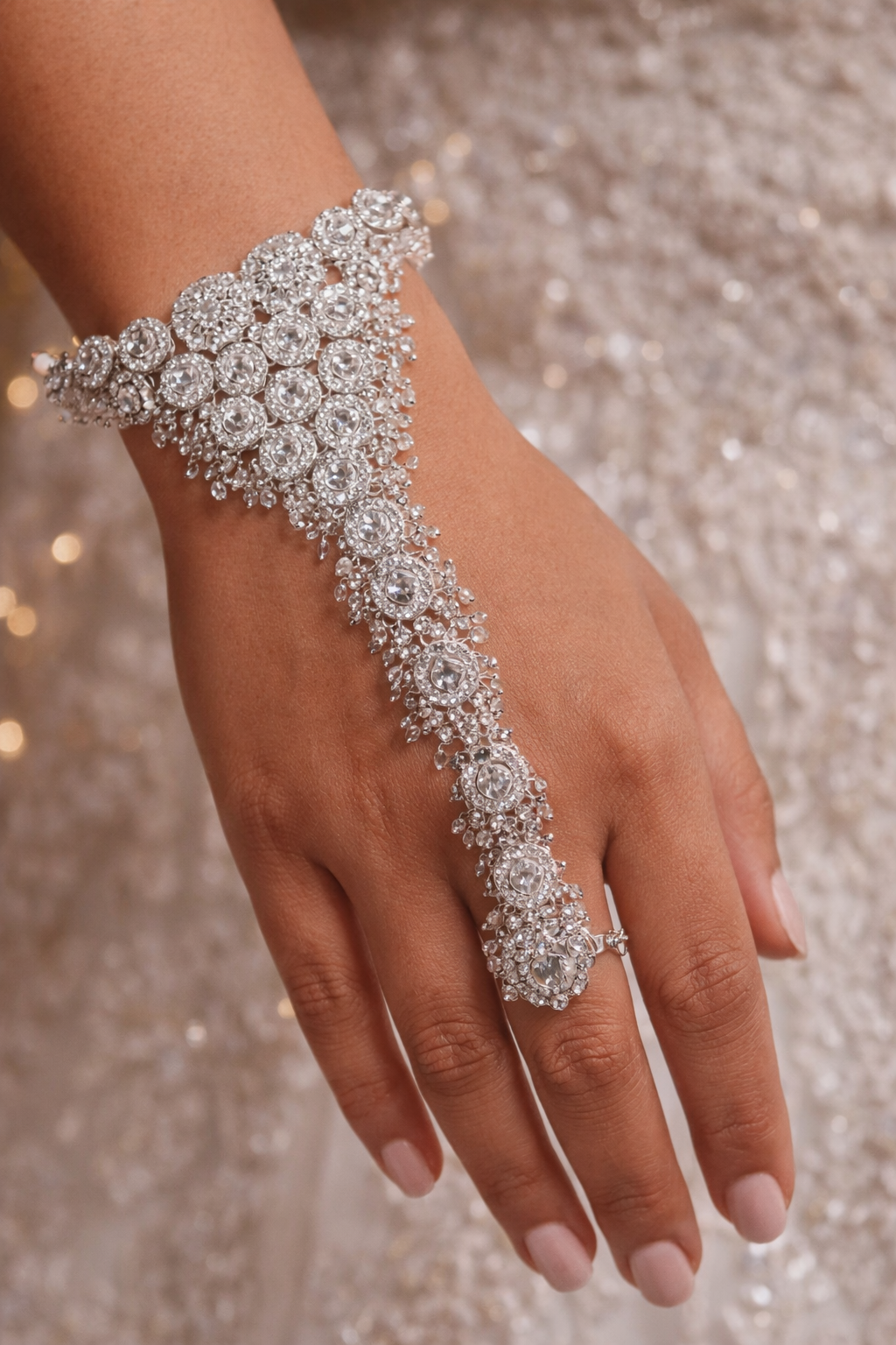 Luxury Silver Crystal Hand Harness Bracelet – Bridal Haath Phool Ring Bracelet