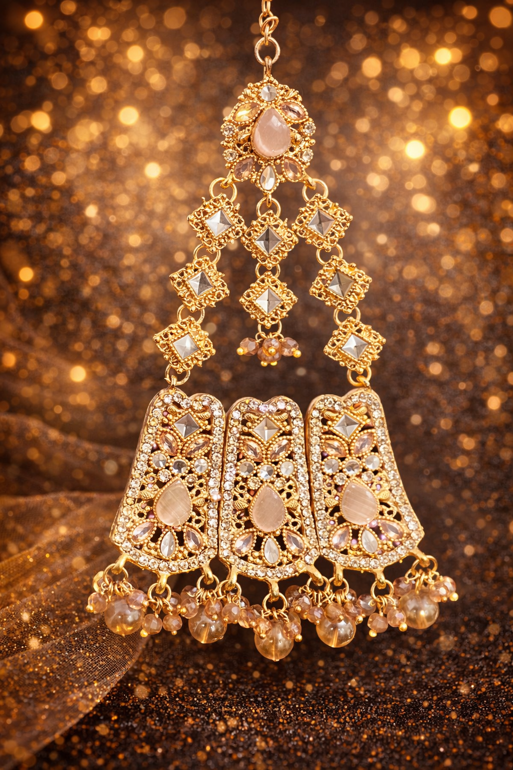 Gold Plated Bridal Jhumar with Champagne Crystals & Pearl Drop Detailing – Traditional Head Jewelry