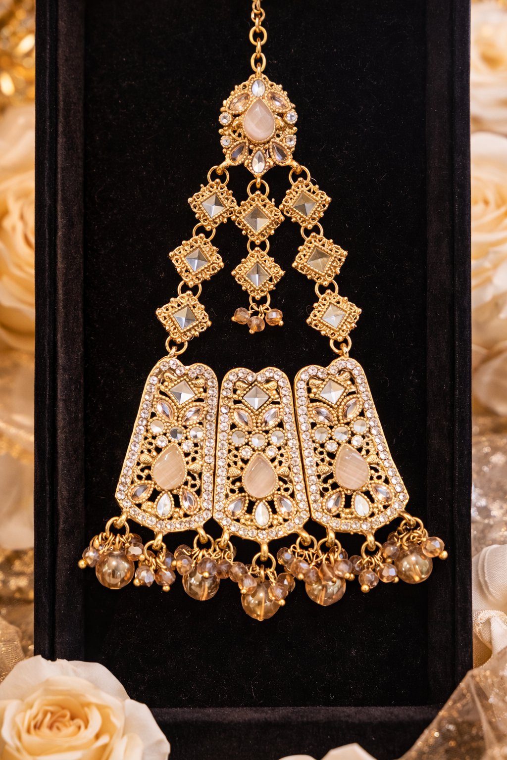 This exquisite gold-plated bridal jhumar showcases intricate antique-style craftsmanship adorned with champagne-tone crystals, kundan accents, and soft pearl drop detailing. The cascading design creates a graceful and royal look, perfect for brides and special occasions. Ideal for weddings, mehndi, nikkah, walima, and festive events, this jhumar adds timeless elegance and traditional charm to any bridal ensembl