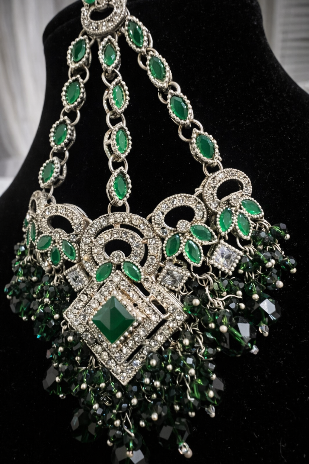This stunning emerald green bridal necklace features intricate silver-tone kundan work adorned with sparkling crystals and rich green stones. Finished with elegant green bead drops, it creates a bold, royal look—perfect for brides, weddings, and festive occasions.
