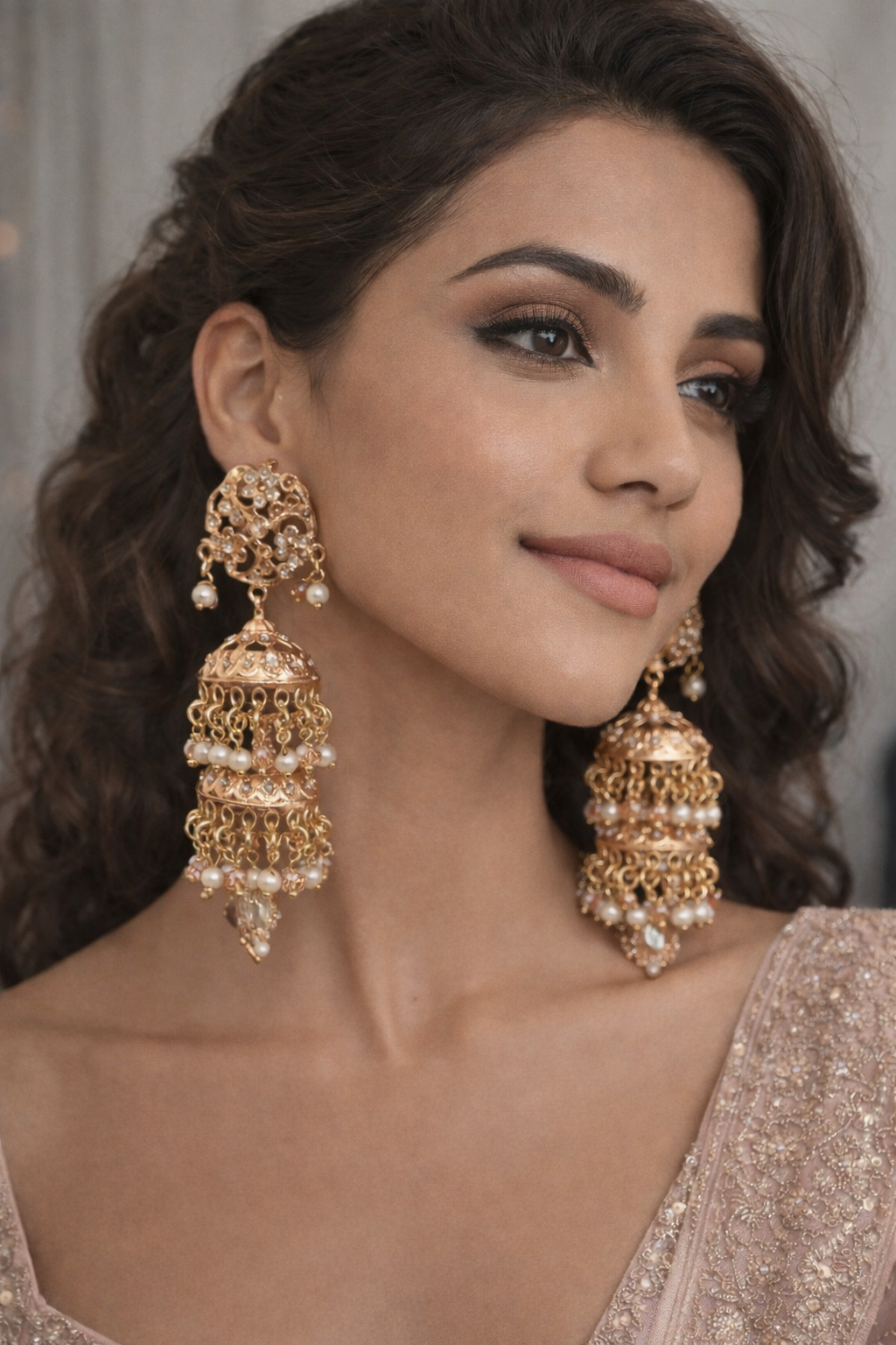 Luxury Gold Plated Pearl & Crystal Jhumka Earrings – Traditional Bridal Jewelry