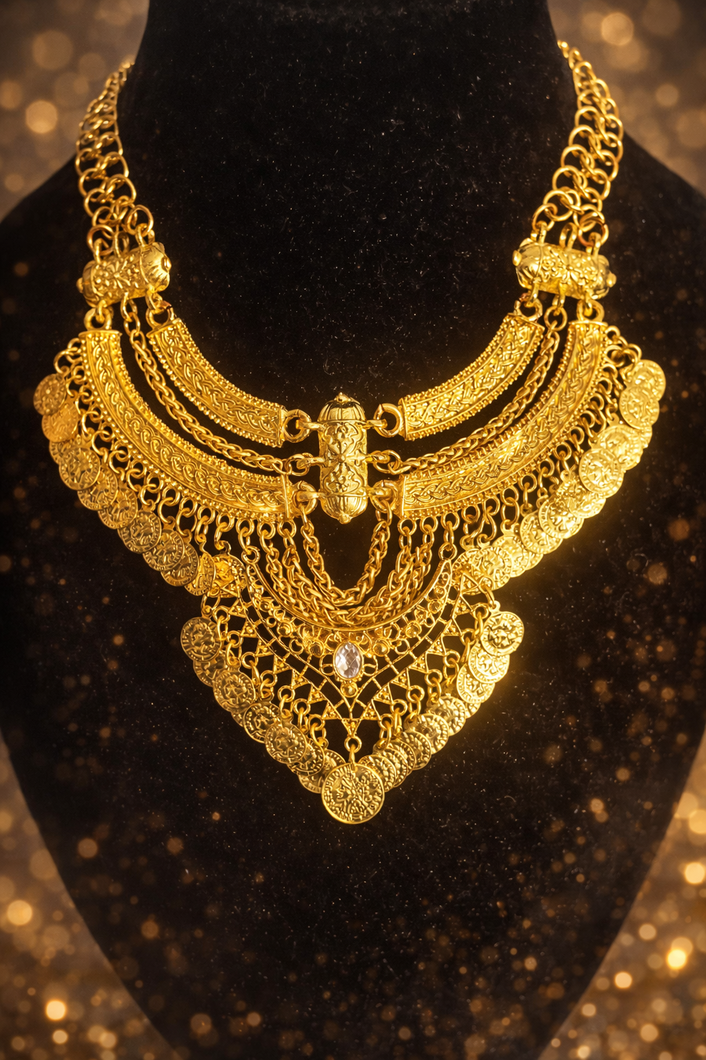 This stunning sea shell–inspired statement necklace features intricate golden chains, engraved coin charms, and a rich vintage finish. Designed in a bold tribal style, it adds a royal and elegant touch to festive outfits, weddings, and special occasions. Perfect for women who love unique, traditional jewelry with a modern edge.