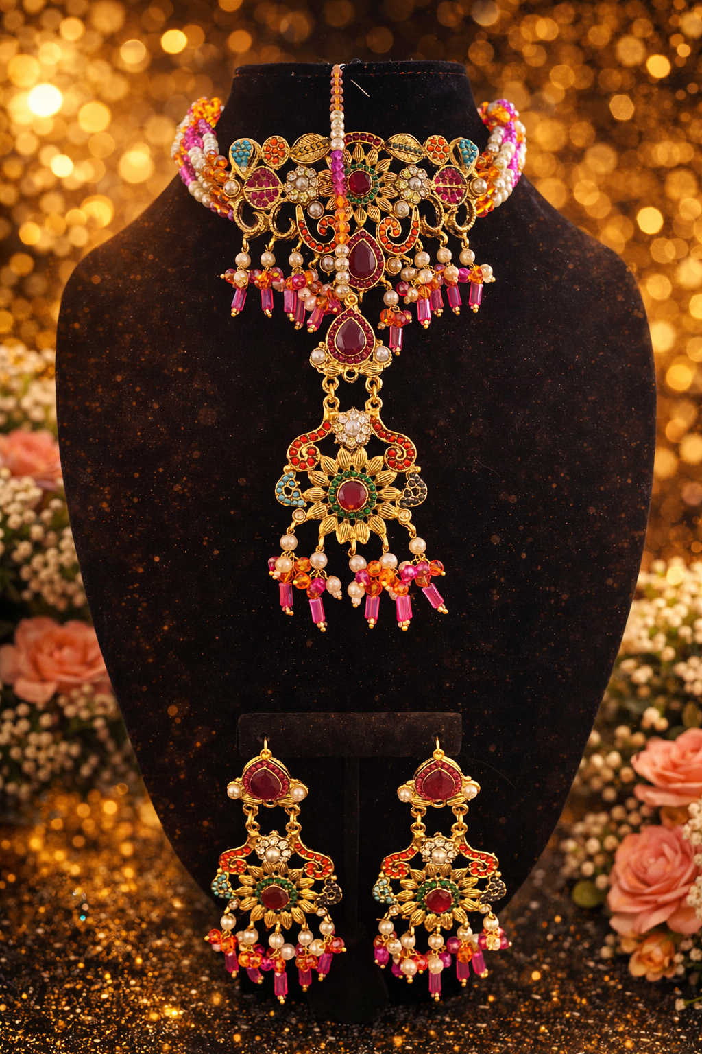 This exquisite gold-plated choker necklace showcases intricate kundan craftsmanship highlighted with rich ruby, emerald green, turquoise, and pearl accents. The detailed floral motifs are enhanced with delicate pearl and crystal bead drops, creating a vibrant royal look. Paired with matching statement earrings, this set is perfect for brides, weddings, mehndi, receptions, and festive celebrations. A timeless piece that brings color, elegance, and heritage charm to any traditional outfit.