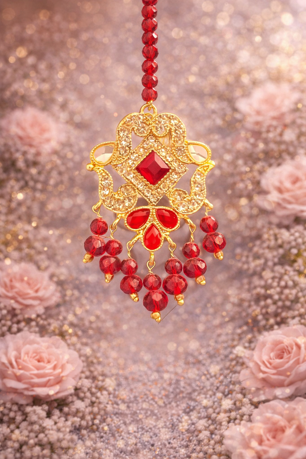 This stunning gold-plated choker necklace set is beautifully crafted with rich ruby-red stones, kundan detailing, and elegant crystal accents. The multi-strand red bead choker is highlighted with an ornate centerpiece and finished with delicate bead danglers. A matching long pendant and statement earrings complete the regal bridal look. Perfect for weddings, mehndi, receptions, and festive occasions, this set adds timeless elegance and royal charm to traditional attire.