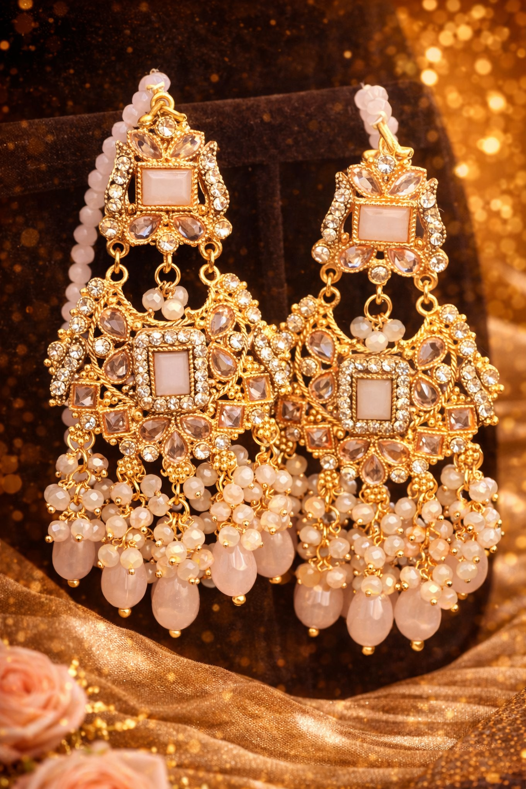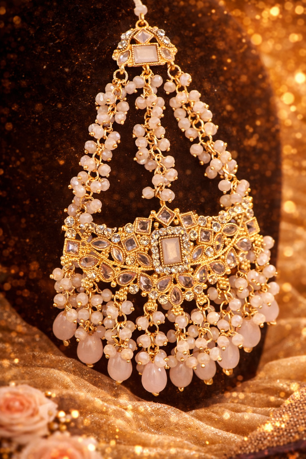 This elegant bridal choker set features a rich gold finish adorned with classic white kundan stones and delicate crystal detailing. The choker is beautifully finished with soft white teardrop pearl danglers, creating a graceful and timeless look. Paired with matching statement earrings and a coordinating maang tikka, this set is perfect for brides and festive occasions. Ideal for weddings, nikah, walima, engagement, and formal events, it complements lehengas, sarees, and bridal gowns effortlessly.