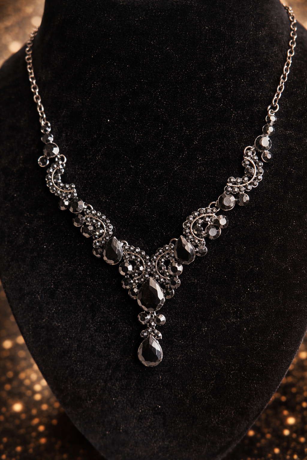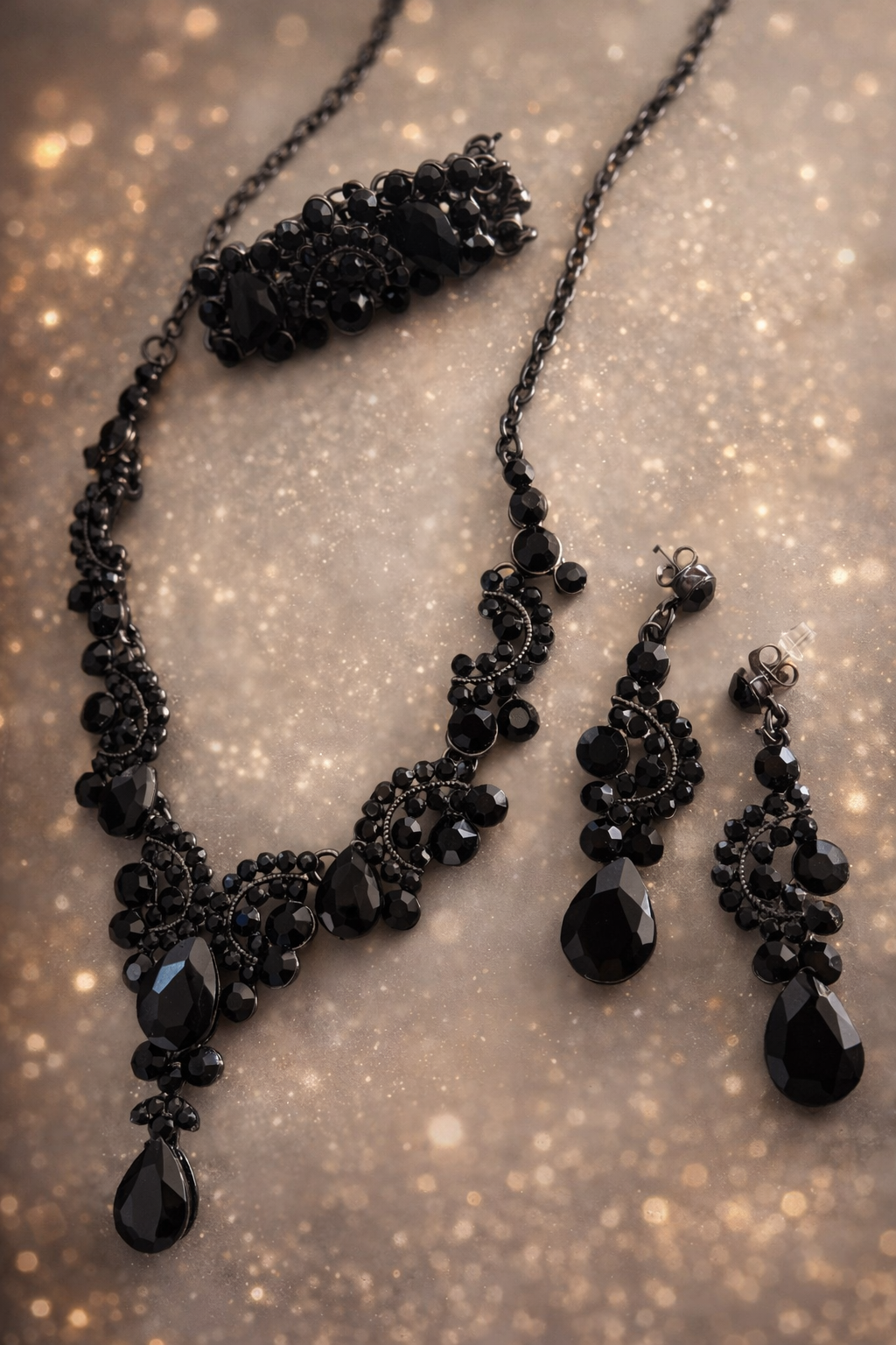 This elegant black crystal necklace set features faceted bead detailing with graceful teardrop pendants. Paired with matching drop earrings, it creates a bold yet refined look—perfect for evening wear, parties, weddings, and festive occasions. A timeless design that adds sophistication to any outfit.