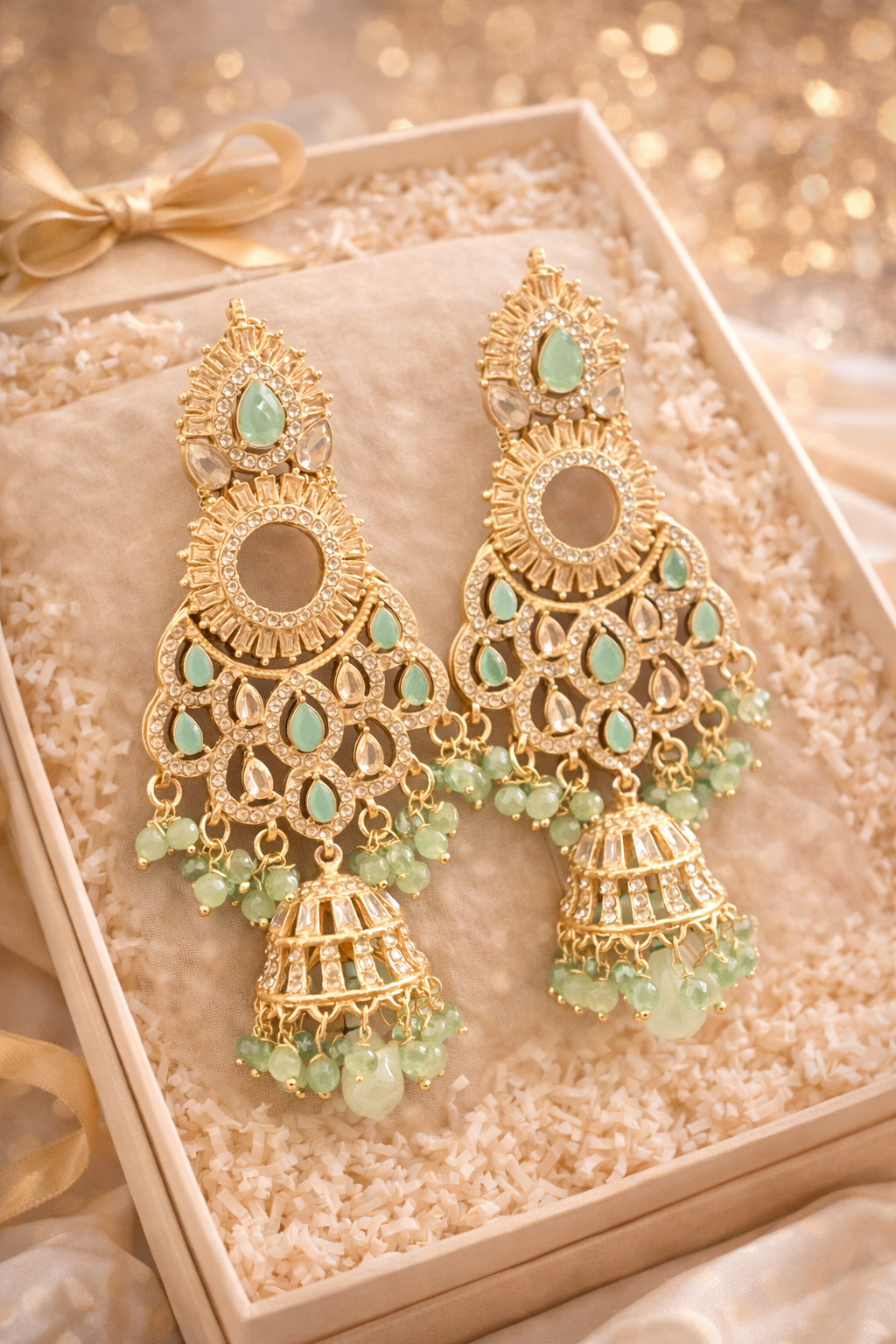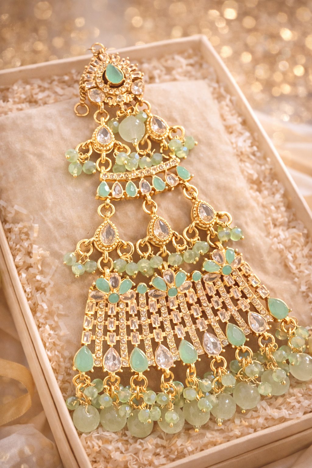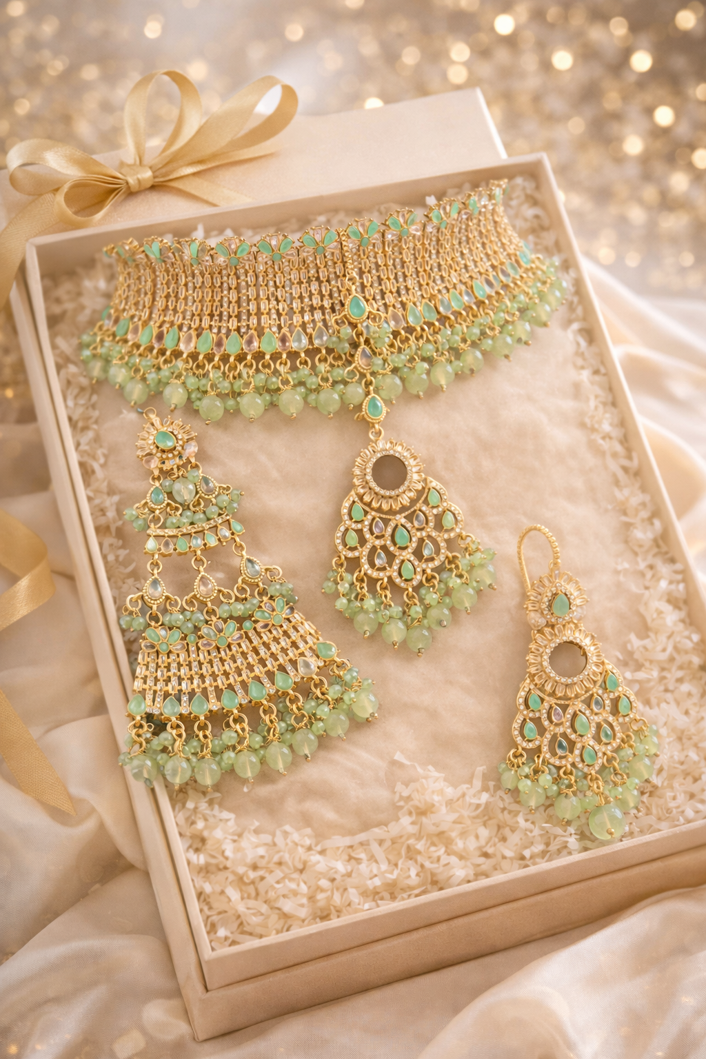 This stunning bridal choker set is crafted in a rich gold finish and beautifully embellished with soft mint green kundan stones and delicate crystal detailing. The choker features elegant floral motifs and cascading bead drops, paired with matching statement earrings and a coordinating maang tikka. Designed for brides who love soft, graceful hues, this set is perfect for mehndi, nikah, engagement, festive occasions, and elegant daytime weddings. A timeless piece that adds freshness and charm to any bridal ensemble.