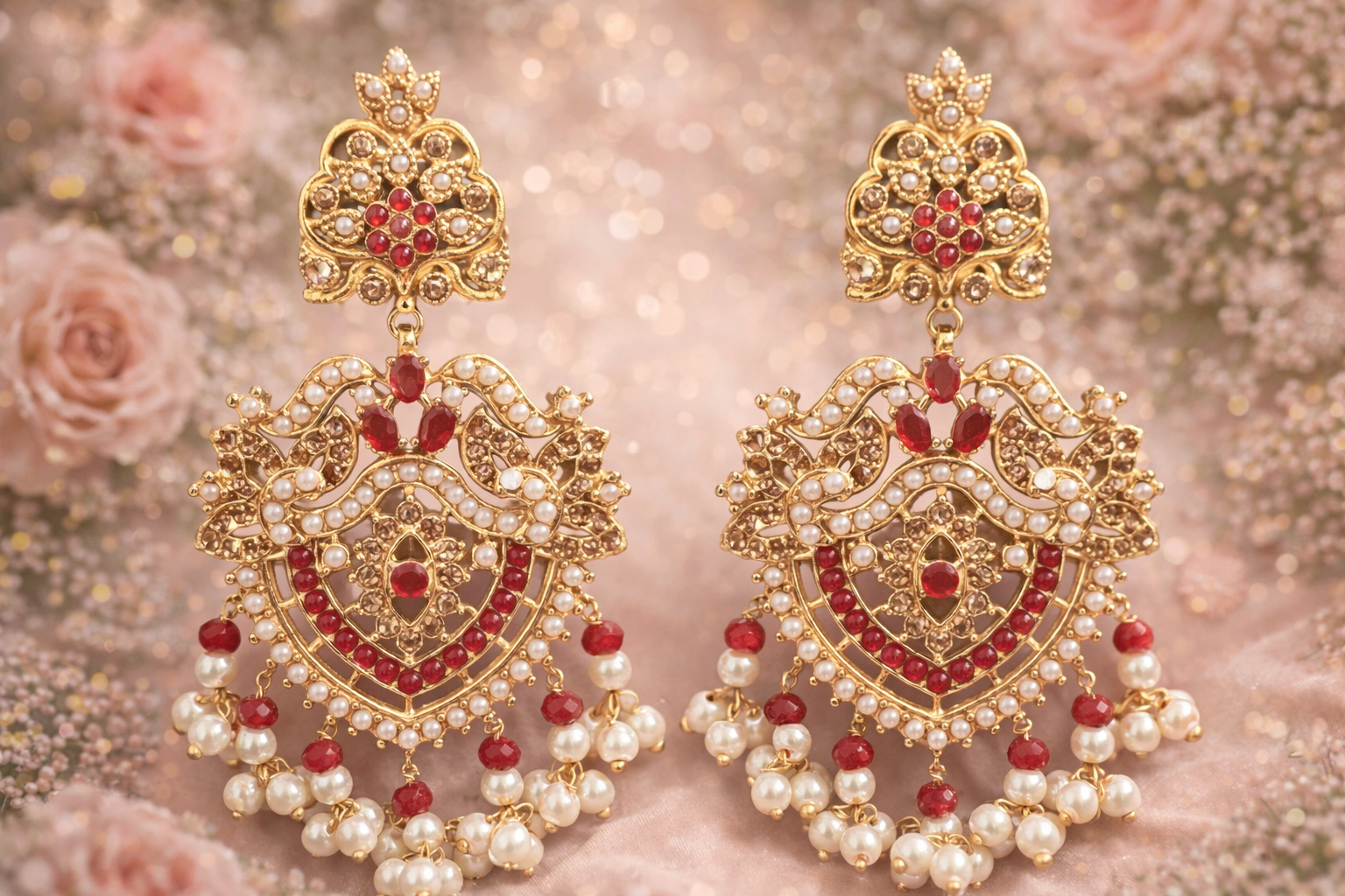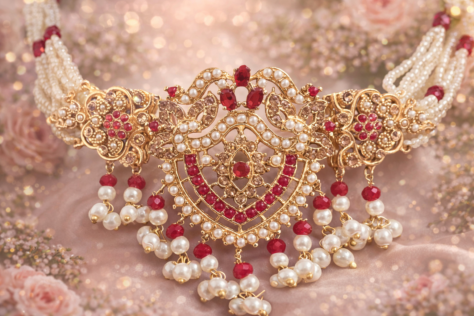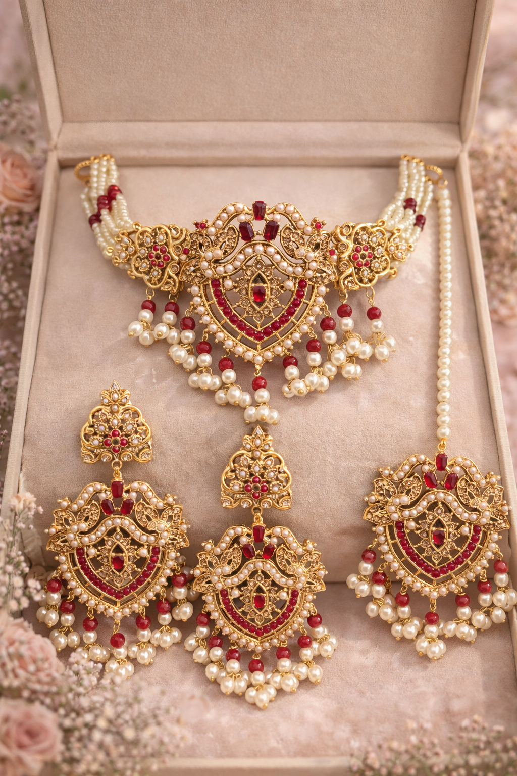 This stunning bridal jewelry set features an intricately crafted gold-plated necklace adorned with deep ruby-red stones and luminous pearls. The traditional filigree design is enhanced with elegant pearl danglers, creating a rich royal look. Paired with matching statement earrings and a coordinating tikka, this set is perfect for brides, weddings, receptions, and festive occasions. A timeless piece that adds grace, luxury, and cultural elegance to any bridal ensemble.