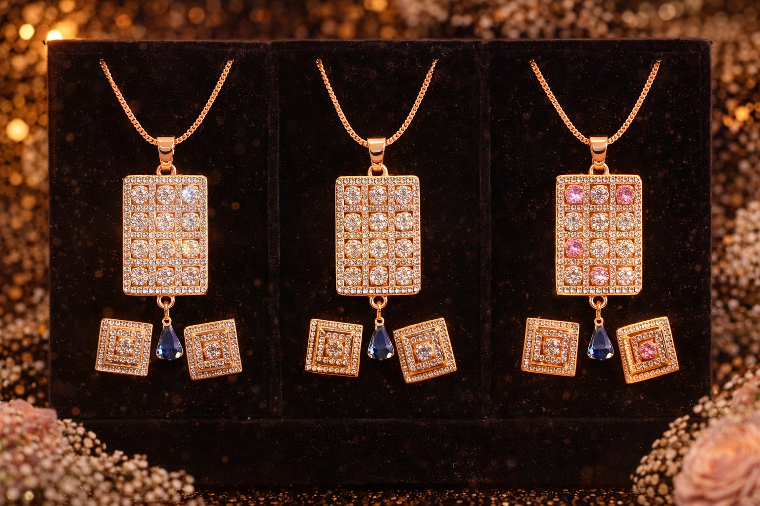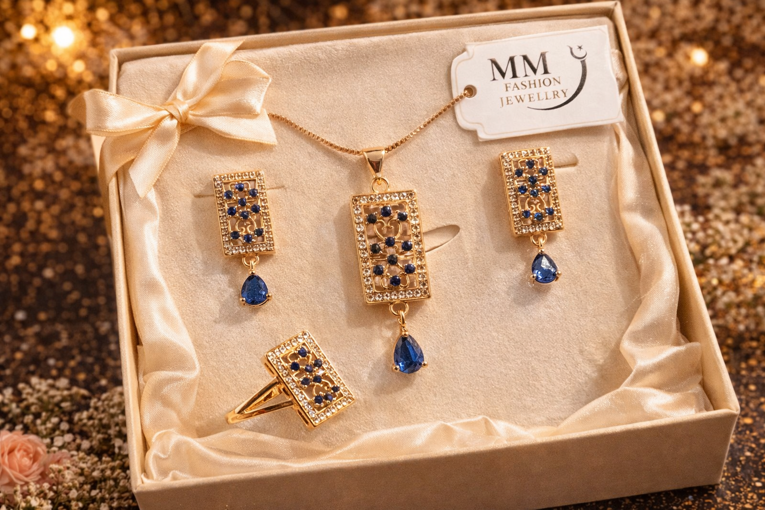 This exquisite gold-plated jewelry set features a beautifully coordinated necklace, matching earrings, and a statement ring, all adorned with deep sapphire-blue crystals and sparkling clear stones. The geometric design adds a modern yet royal touch, making it perfect for parties, weddings, festive occasions, and elegant gifting. Presented in a luxurious gift box, this set is ideal for special occasions, celebrations, and stylish everyday glamour.