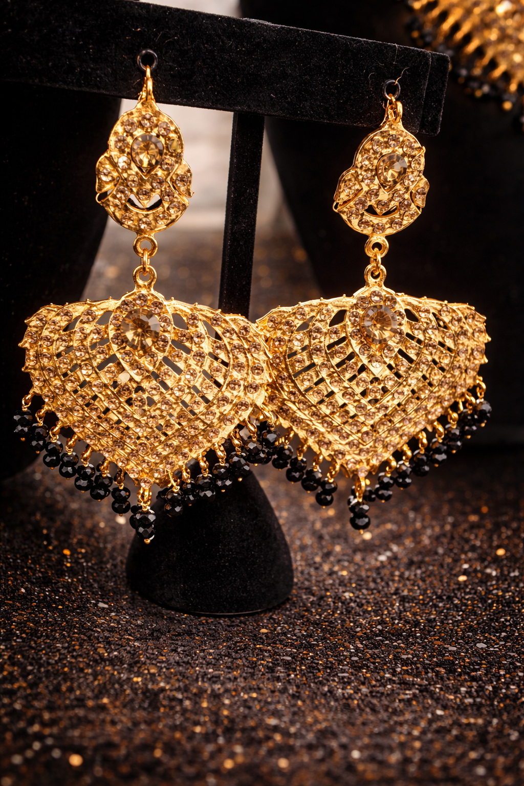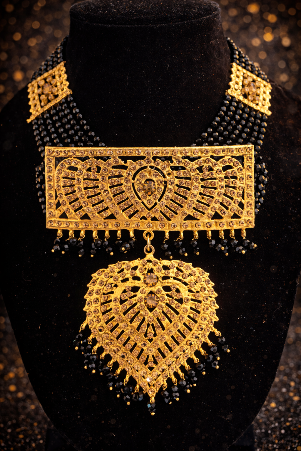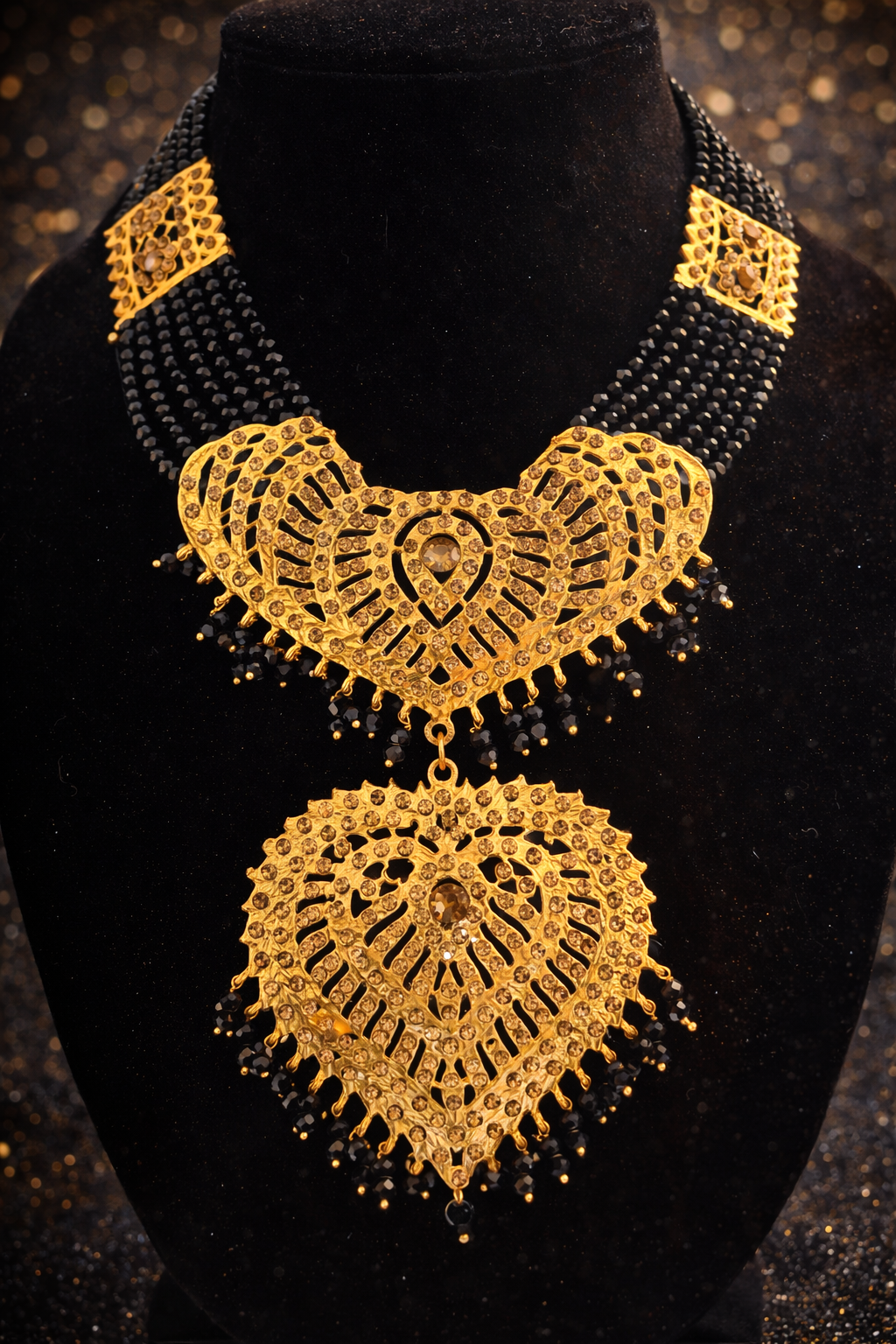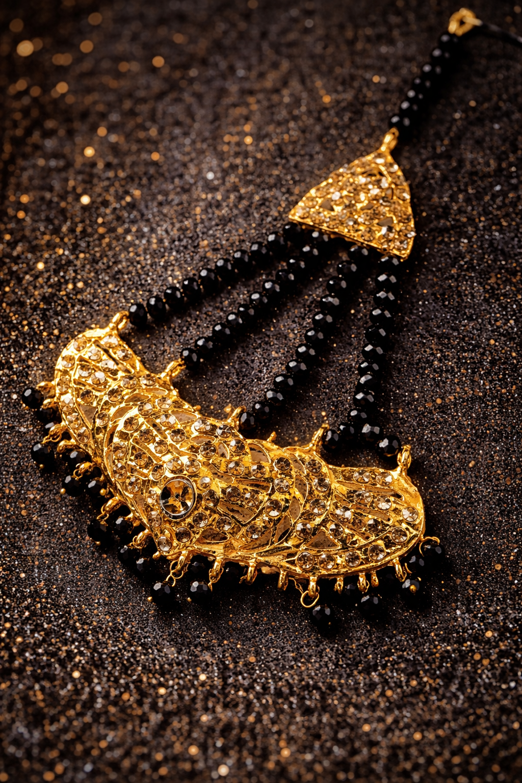 This stunning black beaded bridal necklace set features rich gold-plated craftsmanship with intricate traditional detailing and elegant black bead accents. Presented beautifully in a gift box, the set includes a statement necklace, matching earrings, and a coordinating tikka, creating a perfectly balanced bridal look. Ideal for weddings, nikkah, walima, receptions, and festive occasions, this set adds timeless charm and royal elegance to any outfit.