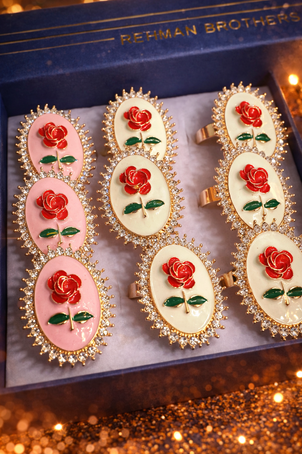 Make a graceful statement with these elegant oval rose enamel rings, featuring a beautifully detailed red rose motif on soft pastel enamel bases. Framed with sparkling crystal accents and finished in a luxurious gold tone, these rings blend vintage charm with modern elegance. Available in delicate pink and ivory shades, they are perfect for parties, festive occasions, weddings, or gifting. The adjustable band ensures a comfortable and versatile fit for all finger sizes.