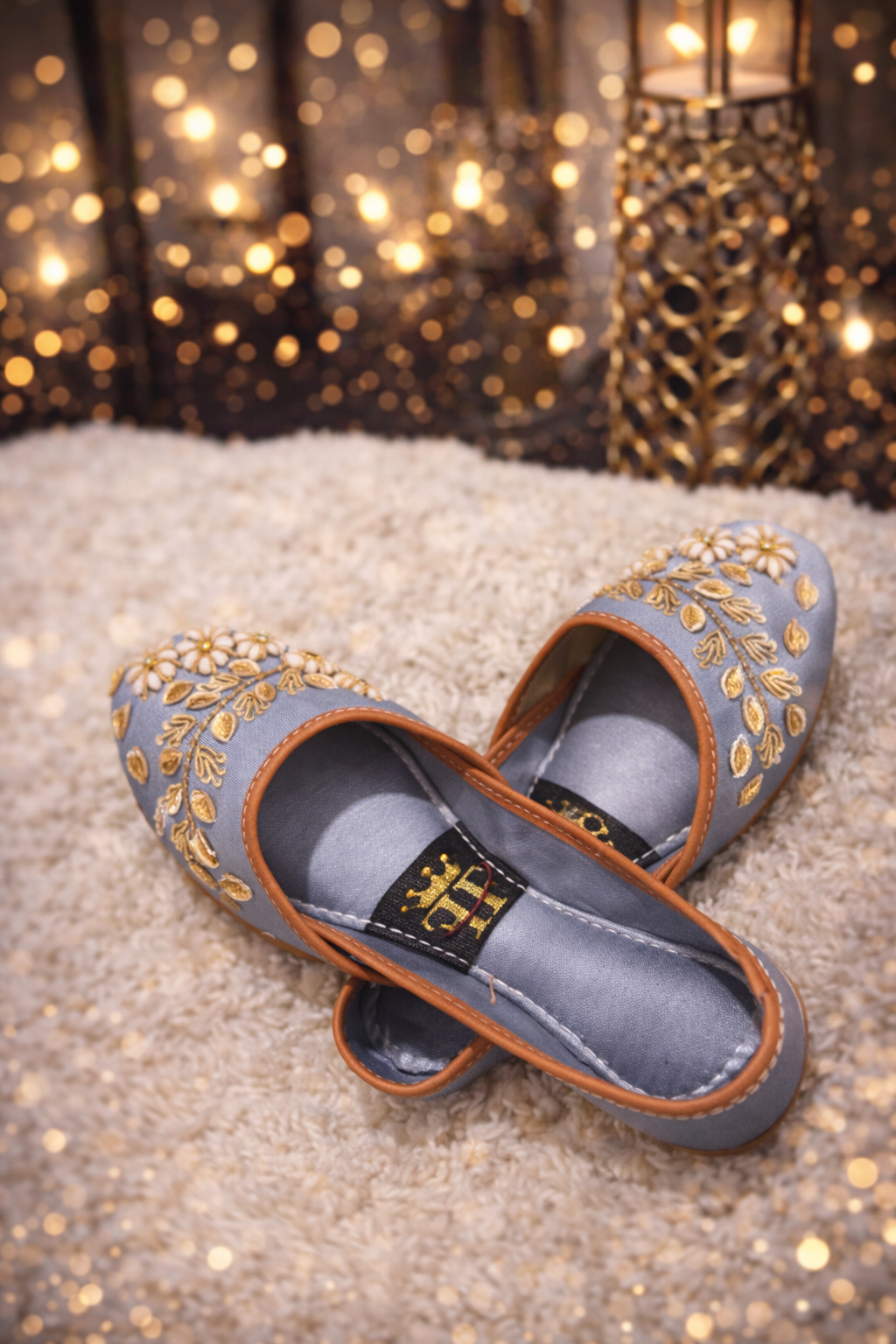 Elevate your ethnic look with these stunning black Indian juttis, beautifully hand-embroidered with intricate gold zardozi and delicate floral detailing. Crafted for elegance and comfort, these traditional flats are perfect for weddings, festive occasions, and formal gatherings. The rich black base paired with golden embroidery gives a luxurious, timeless appeal that complements lehengas, sarees, and anarkalis effortlessly.