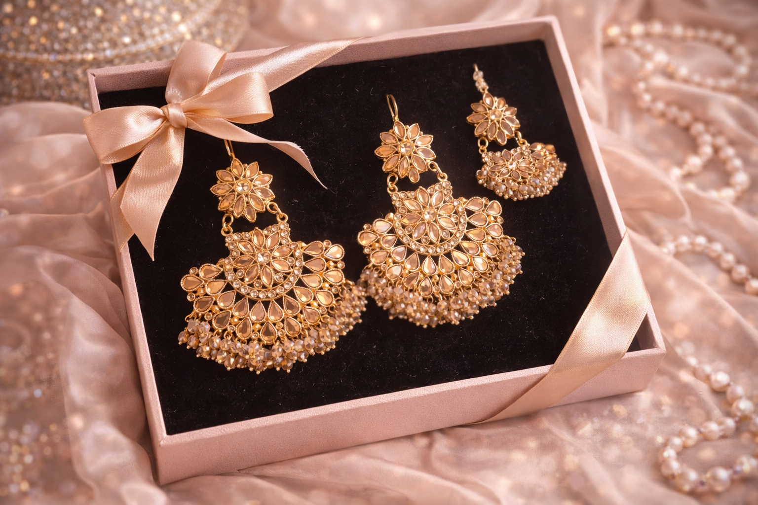 This elegant tikka and earrings set features intricate floral kundan detailing finished in radiant gold tones. Adorned with delicate pearl drop accents, the design blends traditional charm with timeless sophistication. Perfect for brides, wedding festivities, and special occasions, this graceful set adds a regal glow to any ethnic outfit and comes beautifully presented for gifting.