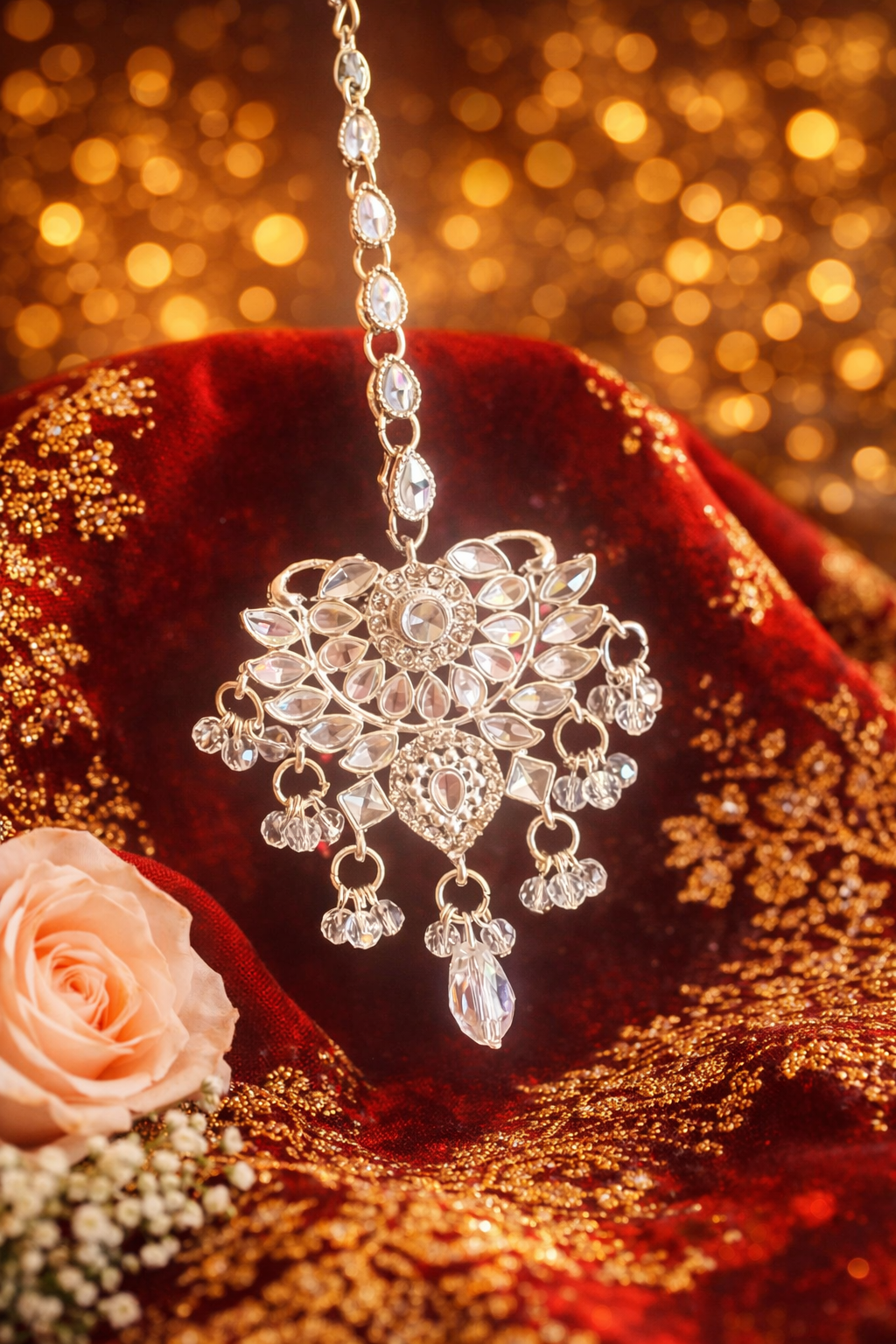 This elegant silver-tone tikka features a delicate floral design adorned with shimmering crystal stones and graceful dangling drops. The refined craftsmanship and radiant sparkle create a timeless headpiece perfect for brides and festive occasions. Ideal for weddings, nikkah, mehndi, and traditional celebrations, this tikka adds a soft, regal glow to any ethnic look.